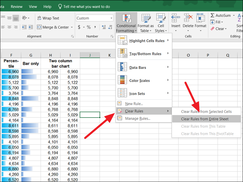 To remove conditional formatting from the entire sheet at once, click the ‘Conditional Formatting’ option under the Home tab, and click ‘Clear Rules’. Then, choose the ‘Clear Rules from Entire Sheet’ option.