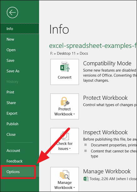 Open your Excel spreadsheet doesn’t matter which one, click the ‘File’ tab at the top left corner and select ‘Options’ from the backstage view left-sidebar.