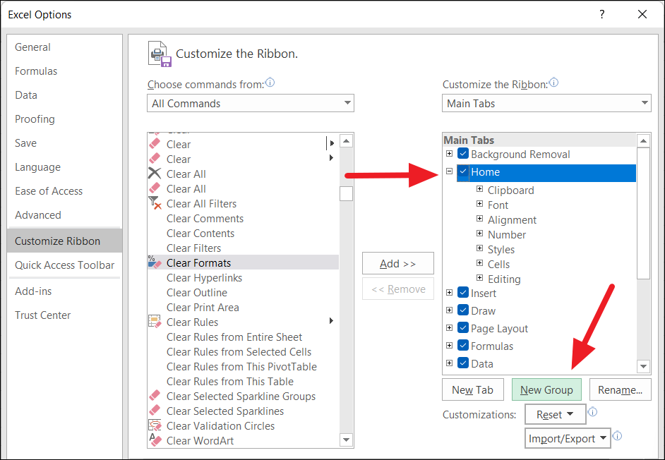 If you feel your Quick Access toolbar is filled with too many buttons, you can create a custom group on the Excel ribbon and add a separate ‘Clear Formats’ button in it which can be quickly accessed with a single click. Here’s how you add the ‘Clear Formats’ button to the Excel ribbon:
