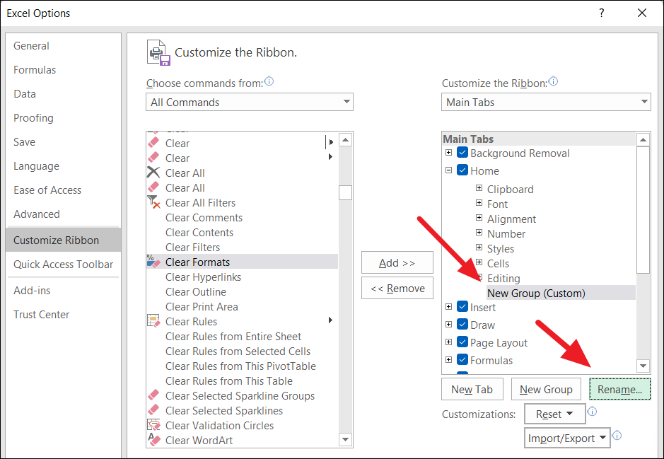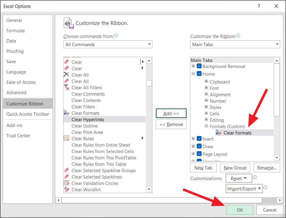 After that, select the newly created group (Formats (Custom)) under Main Tabs. Next, scroll down the list of commands under ‘Choose commands from:’ and select ‘Clear Formats’. Then, click the ‘Add’ button.