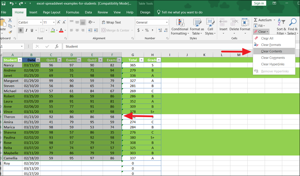 Then, go to the ‘Home’ tab, under the Editing section open up the ‘Clear’ menu (eraser button) and select ‘Clear Contents’.