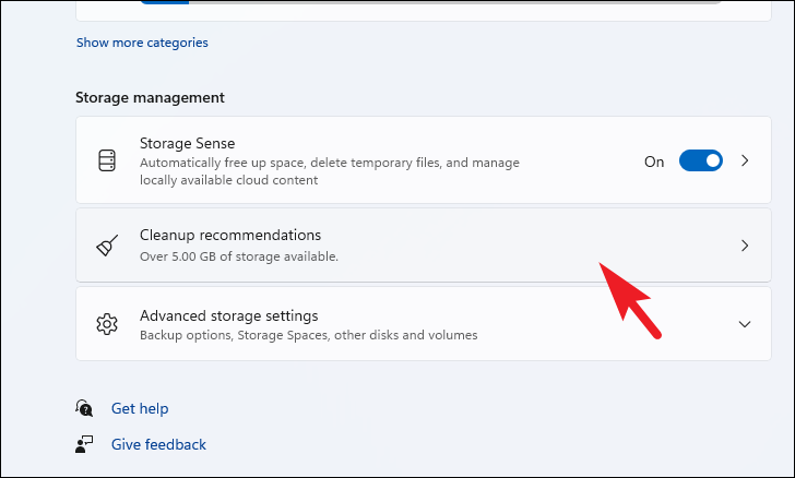 Step 4: Under the Storage management section, click on Cleanup recommendations.