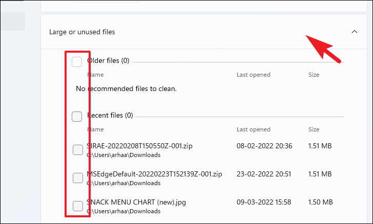 Step 6: Similarly, expand the Large & unused files section. Review the files, select the ones you don't need by checking the boxes next to them, and click Clean up.