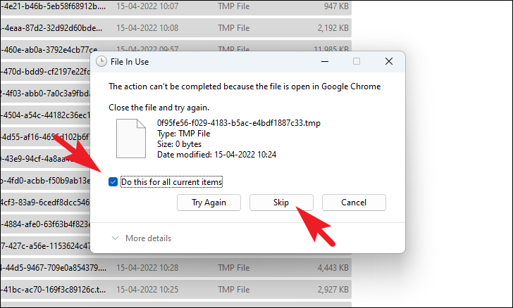 Step 4: If a dialog appears stating that some files are in use and cannot be deleted, check the box next to Do this for all current items and click Skip to proceed without deleting those files.