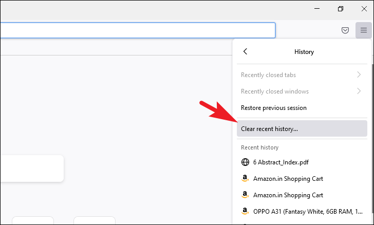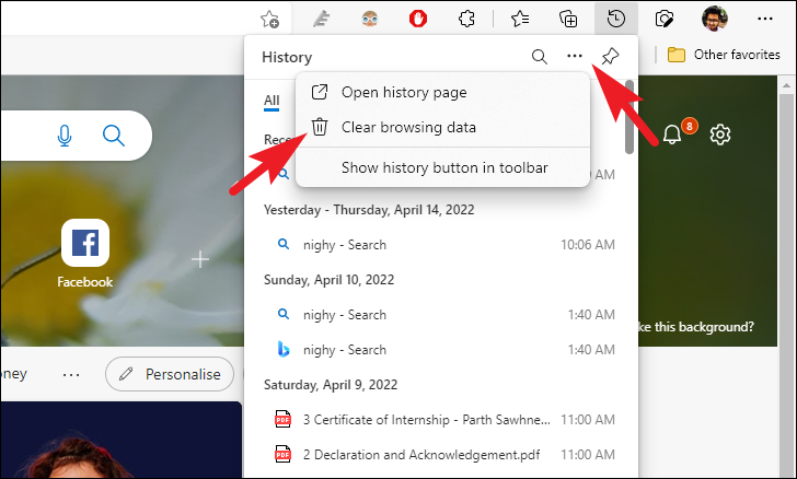 Step 2: Press Ctrl+H to open the History pane. Click on the ellipsis icon in the top-right corner of the pane, and select Clear browsing data. This will open a new tab.