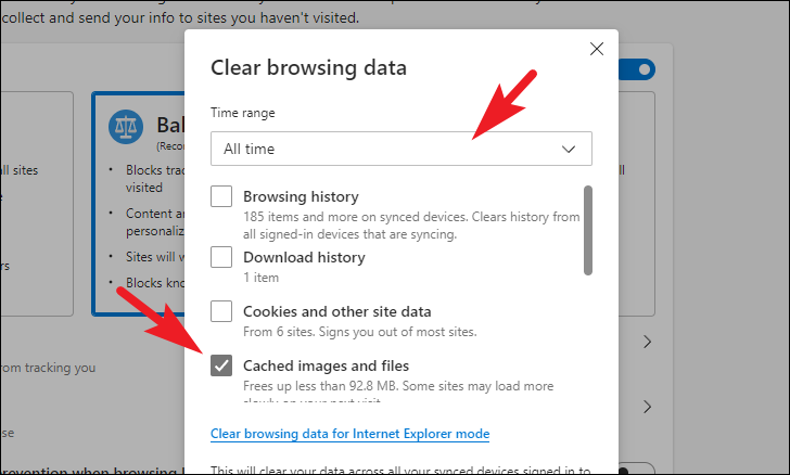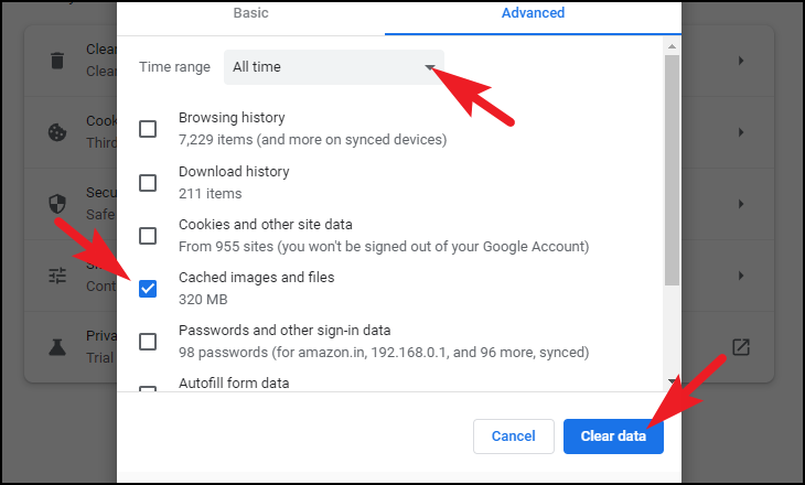 Step 5: In the overlay window, set the Time range to All time. Uncheck all options except Cached images and files. Click Clear data to proceed.