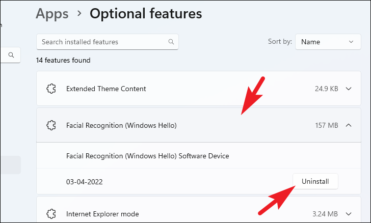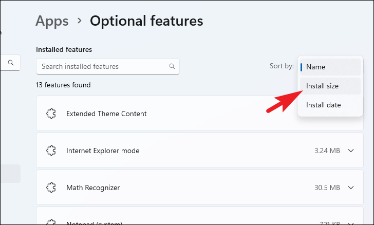 Step 4: Under Installed features, click on the Sort by drop-down menu and choose Install size to list features by their size.