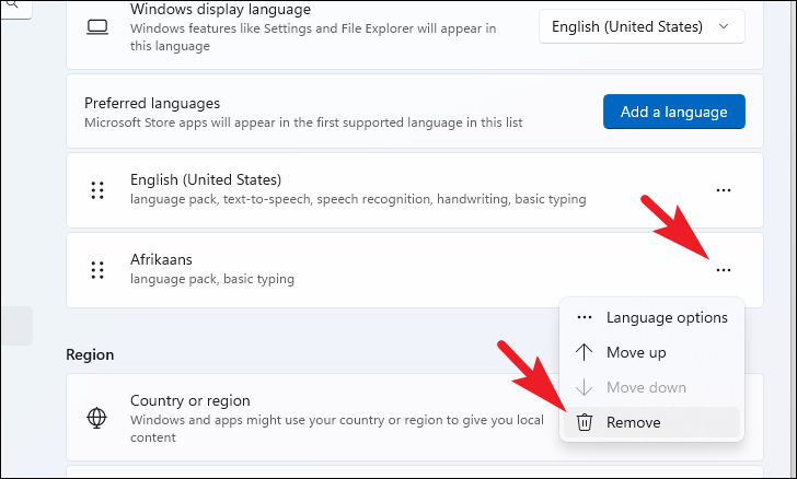 Step 4: Under the Language section, you will see a list of installed languages. Click on the ellipsis icon (three dots) next to the language you wish to remove and select Remove.