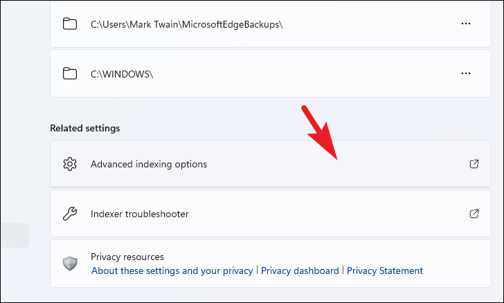 Step 4: Under the Related settings section, click on Advanced indexing options. This will open the Indexing Options window.