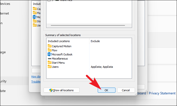 Step 6: Click on Show all locations at the bottom of the Indexed Locations window.