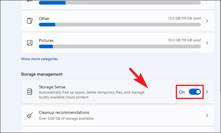Step 4: Under the Storage management section, locate Storage Sense. Toggle the switch to turn it On. If you wish to configure Storage Sense settings further, click on the Storage Sense option.