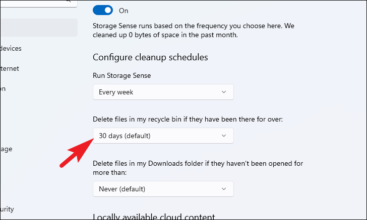 Step 7: Configure how often files in the Recycle Bin and Downloads folder are deleted. Under Delete files in my recycle bin if they have been there for over, select a time period that suits you. Similarly, set a time period under Delete files in my Downloads folder if they haven't been opened for more than.
