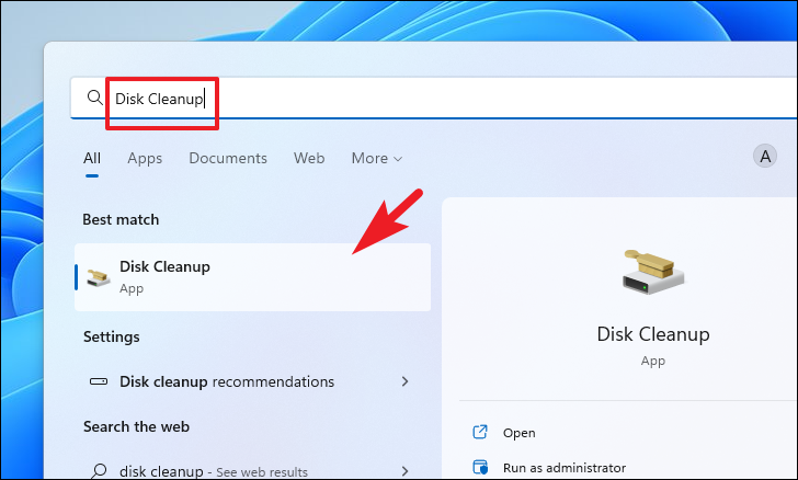 Alternatively, you can press Windows+R to open the Run dialog, type cleanmgr, and press Enter.