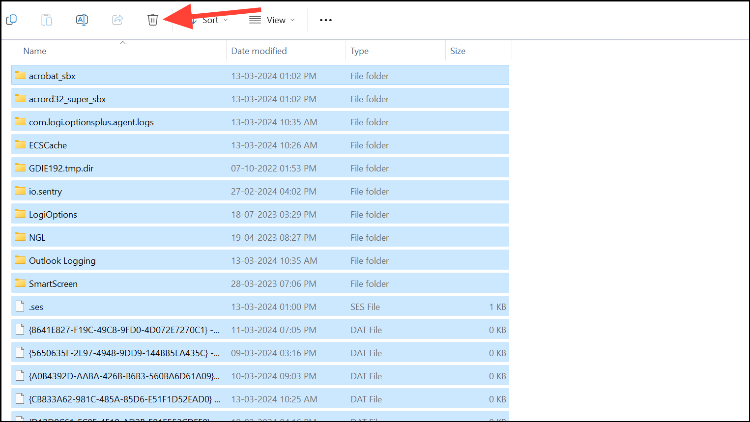 Step 3: Once the Temp folder opens, select all files by pressing Ctrl + A. Delete all the selected files by clicking the 'Delete' icon or pressing the Delete key on your keyboard.