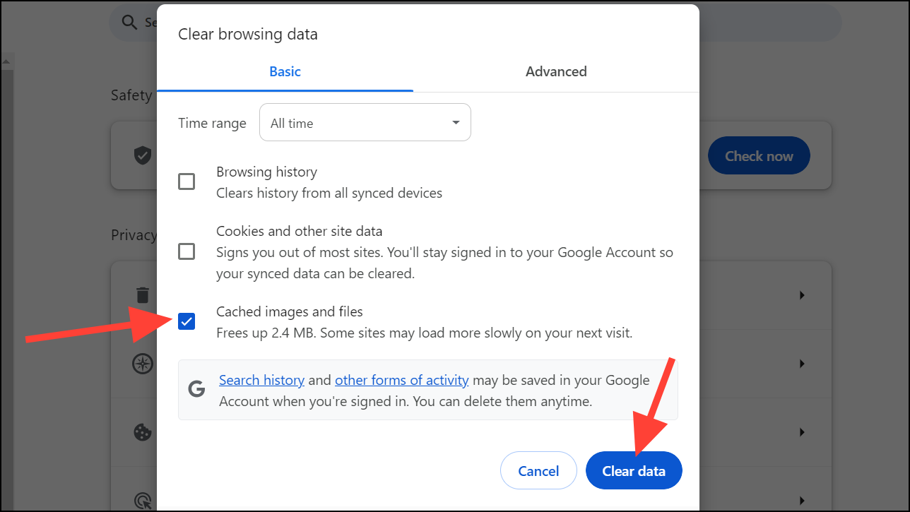 Step 5: In the dialog box that appears, check only the 'Cached images and files' option. Then, click on 'Clear data'.