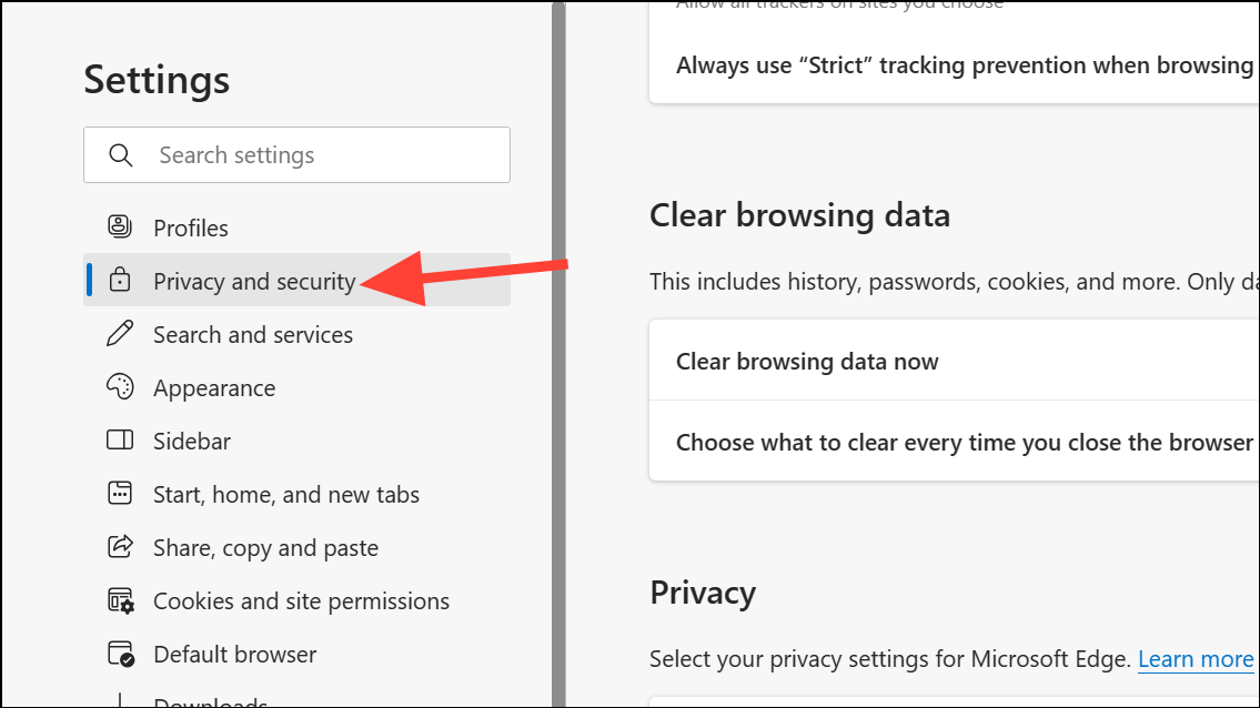 Step 4: In the Settings page, click on 'Privacy and security' from the left navigation pane. Then, on the right, click on 'Clear browsing data'.