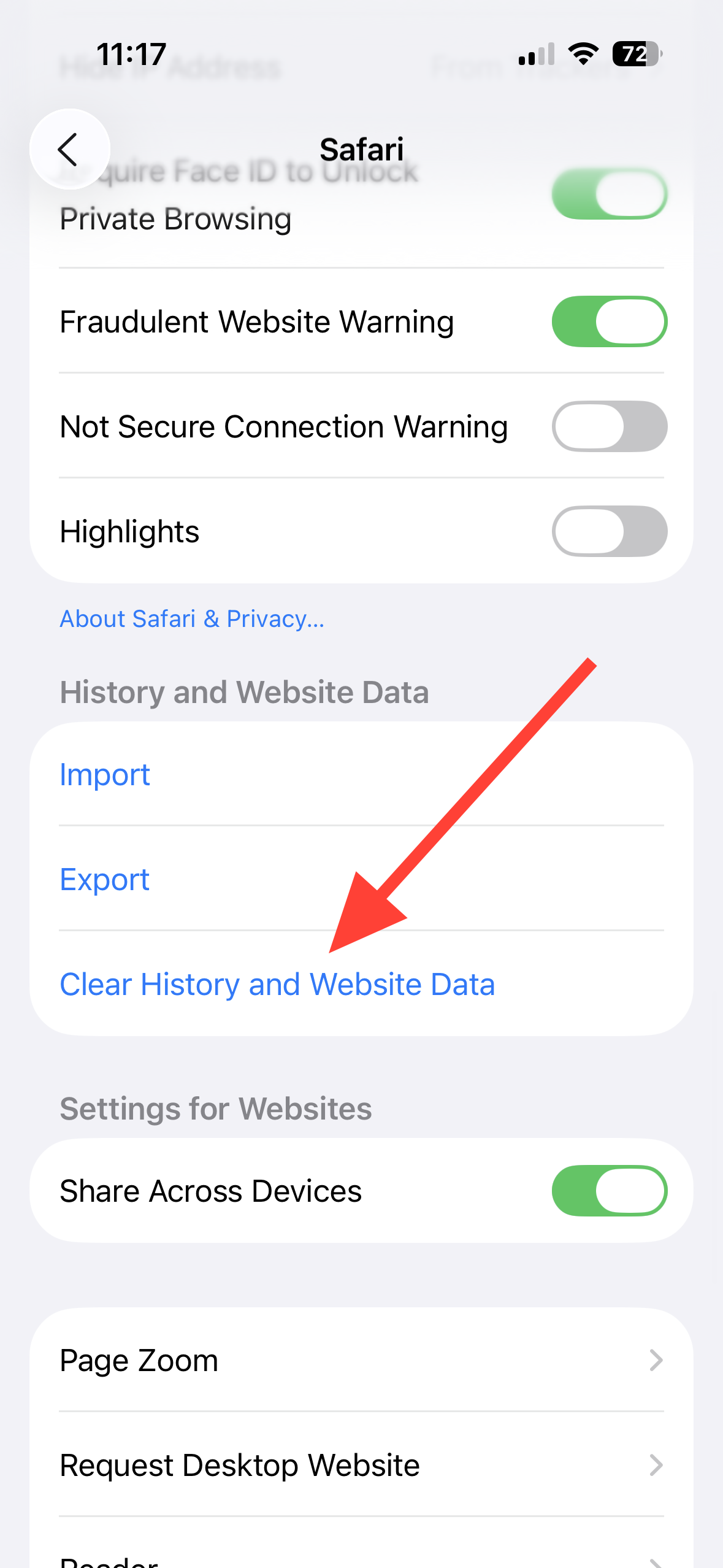 Step 3: Scroll down to near bottom on Safari settings screen and under 'History and Website Data' section, tap 'Clear History and Website Data' option.