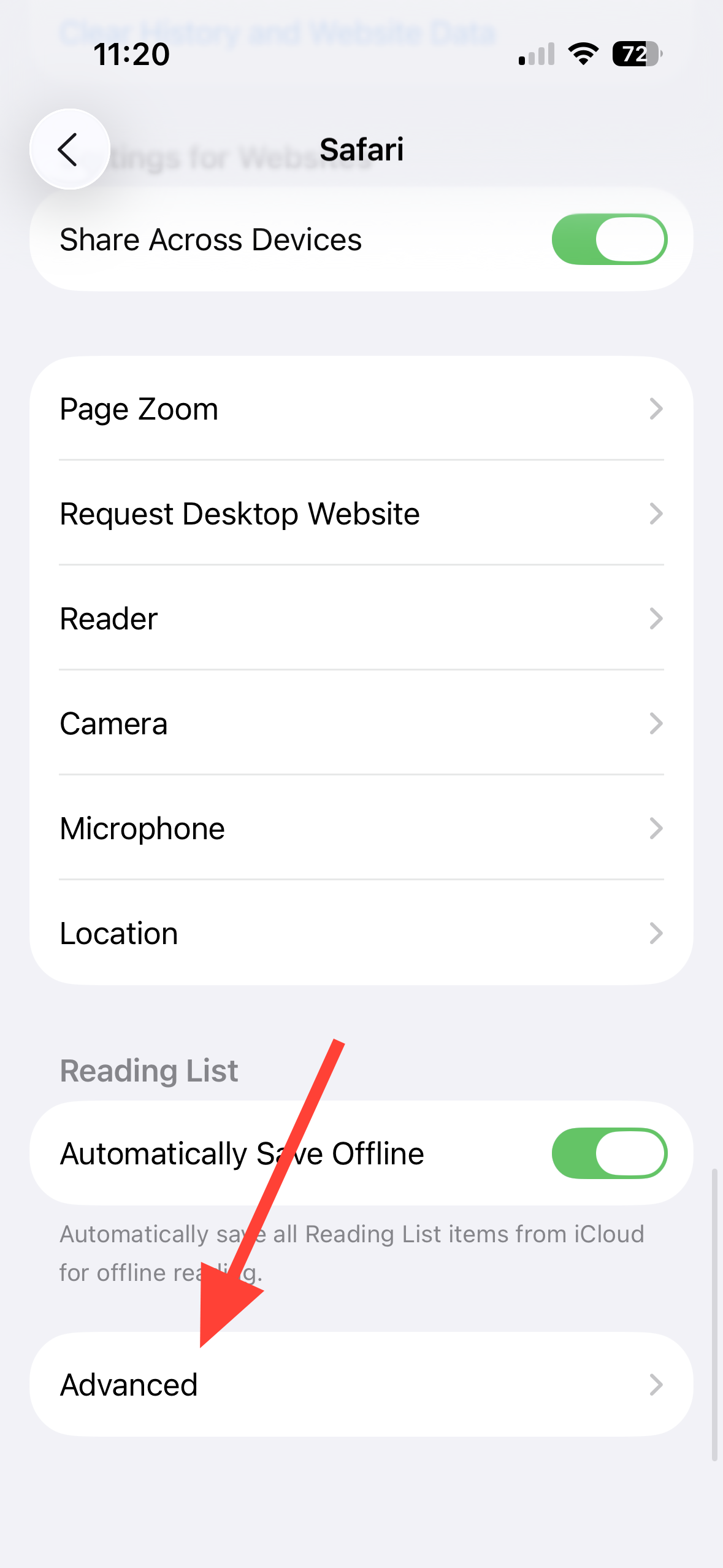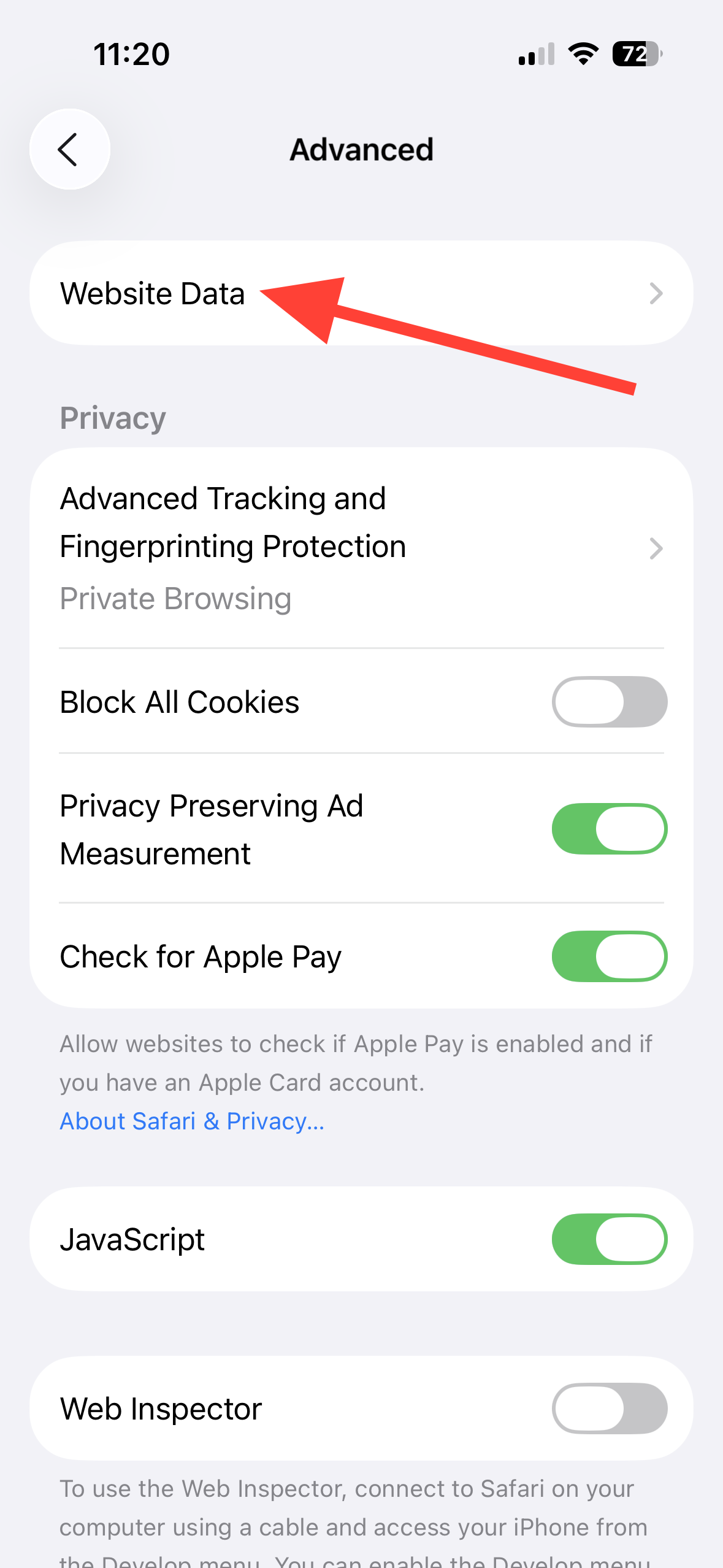 Step 3: Scroll down and tap 'Advanced', then tap 'Website Data'.