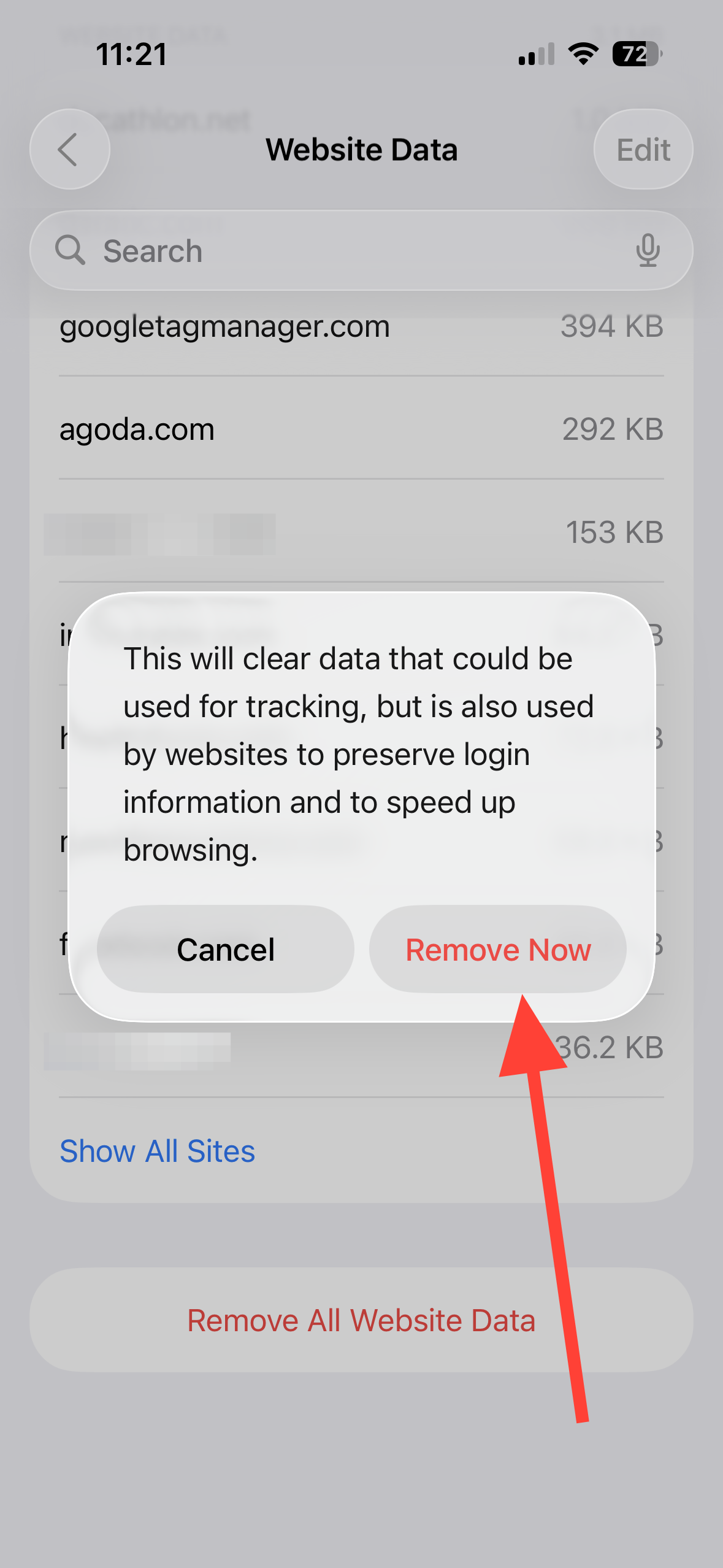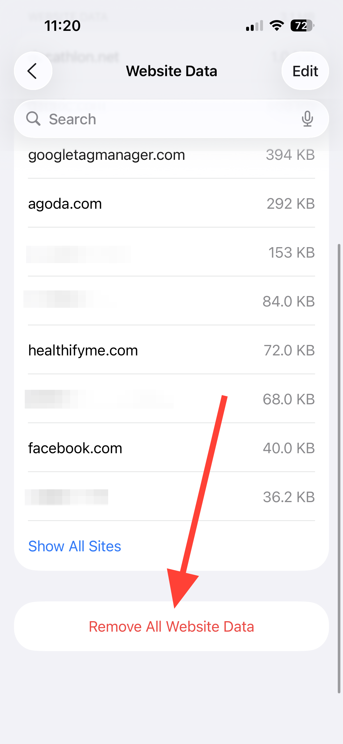 Step 4: Scroll down to bottom of the list, and tap on 'Remove All Website Data' option.