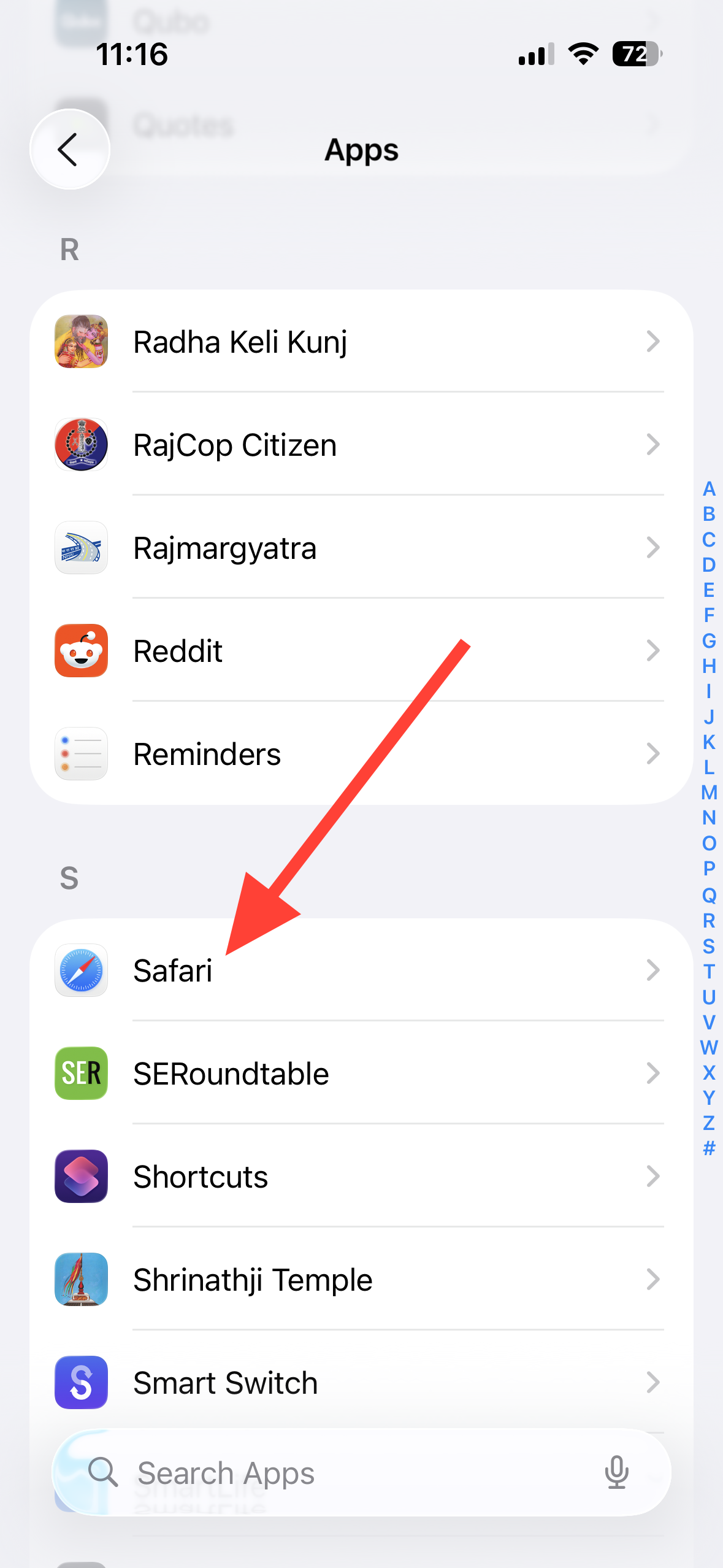 Step 2: Scroll down to the bottom of Settings screen, tap Apps, and then find and select Safari.