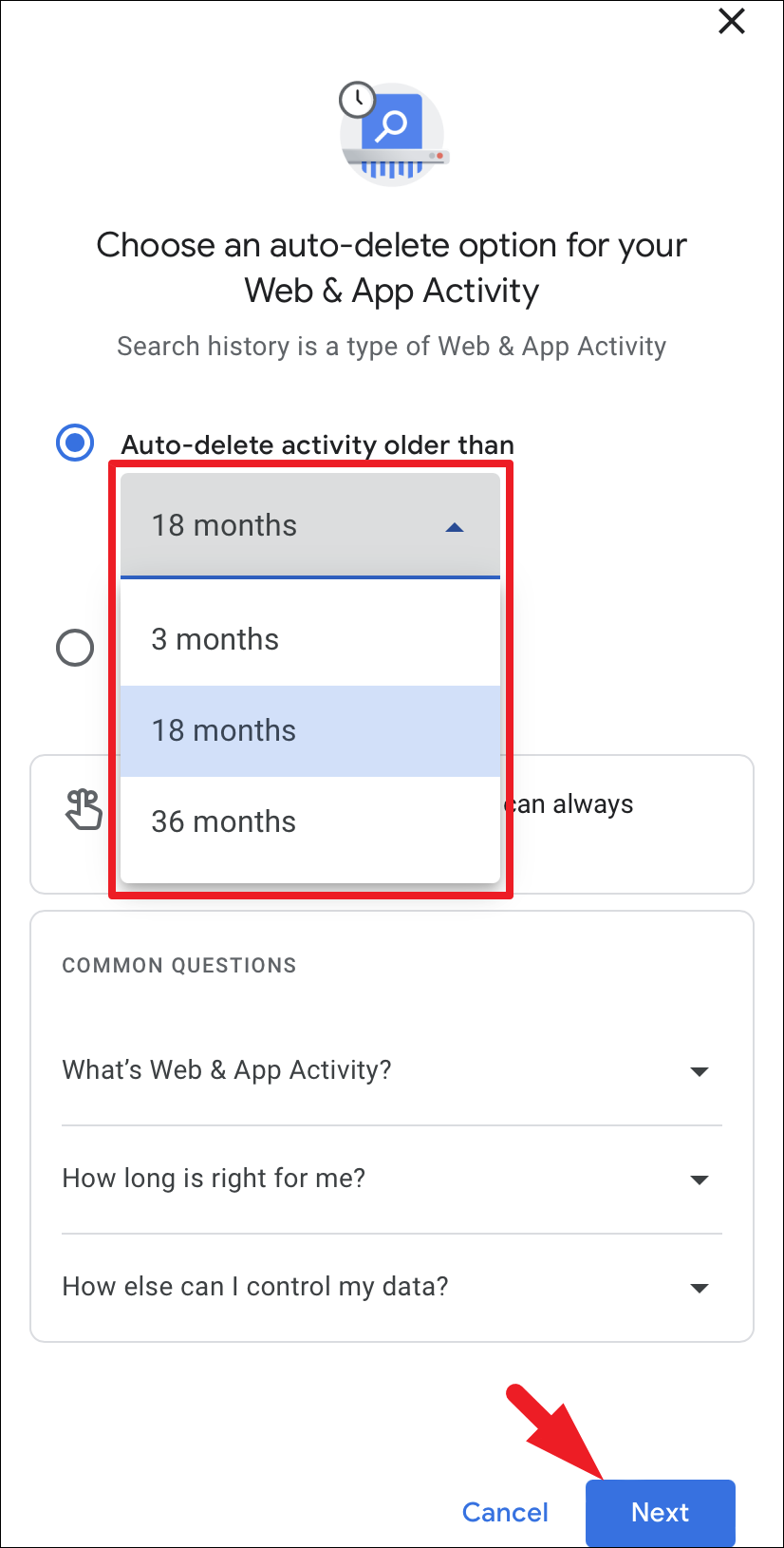 Afterward, tap on the drop-down menu and select the duration after which you wish to delete the activity. The only options are 3, 18, and 36 months. Then, tap on the ‘Next’ button.