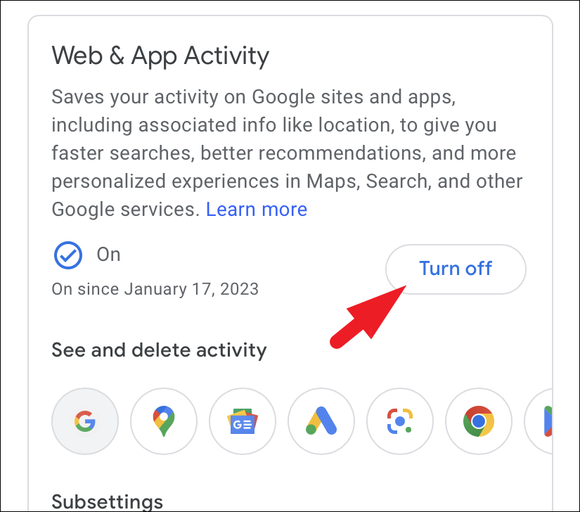 If you do not wish to get into the hassle of deleting your Google search history, you can also choose to completely turn it off. However, do note that turning Google history off will reflect in all Google services and you will not have access to your past activity on Google search, YouTube, Google Photos, and other Google services you might use on your account.