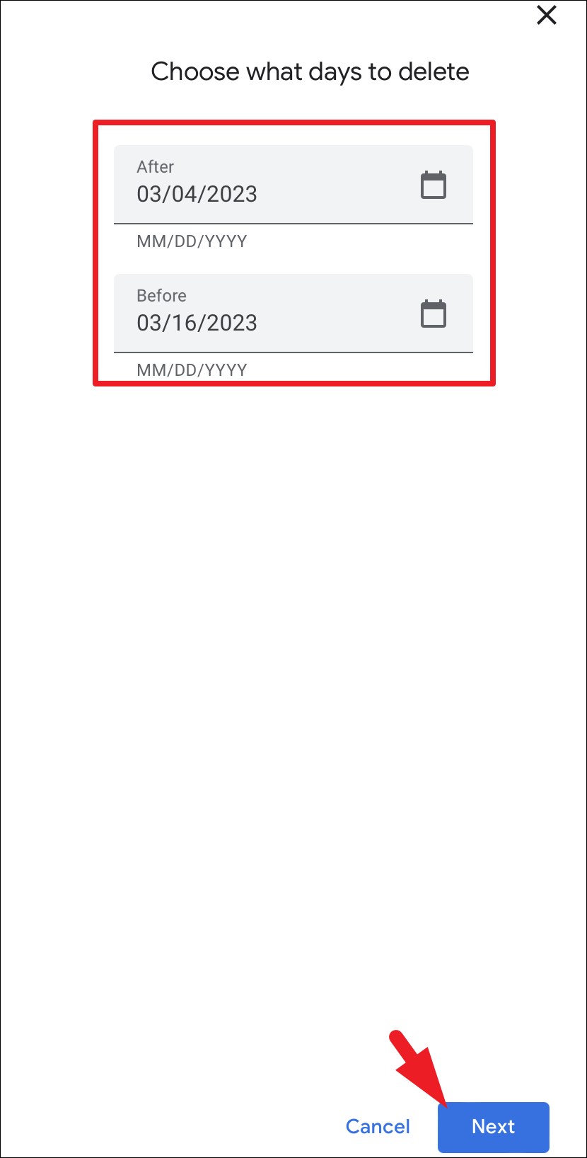 If you chose the ‘Delete custom range’ option, select the date range using the calendar drop-down and tap on the ‘Next’ button to continue.