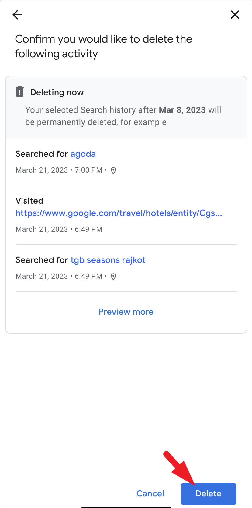 On the next screen, you will be able to see the details of the history. Tap on the ‘Delete’ button to proceed.