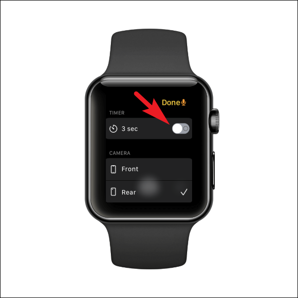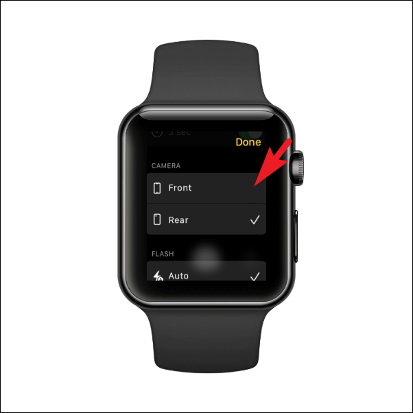 After that, locate the ‘Camera’ section and tap the ‘Front’ option to switch to the front camera on your iPhone. Then, press the ‘Done’ button present in the top right corner of the screen to return to the viewfinder screen on your Apple Watch.