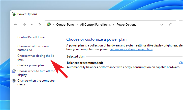Step 3: In the Power Options window, click on Choose what closing the lid does from the options on the left sidebar.