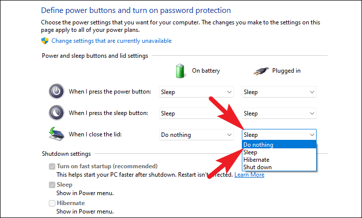 Step 4: Under the Power and sleep buttons and lid settings section, find the option for When I close the lid. Use the drop-down menu next to Plugged in and select Do nothing. It's recommended to change this setting only for when the laptop is plugged in to avoid draining the battery unintentionally. Since external monitors are usually used when the laptop is connected to power, adjusting the plugged-in setting is typically sufficient.