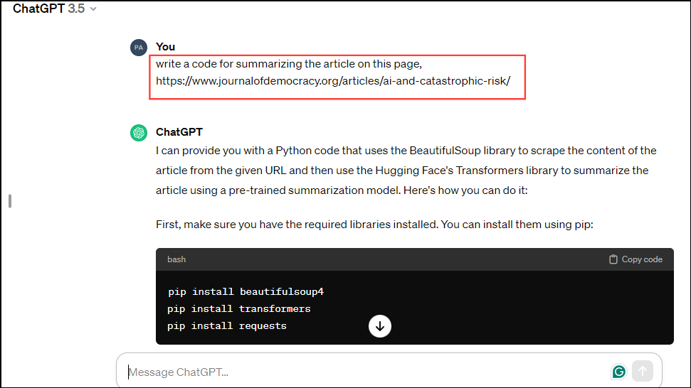 So, in the chat window, enter a prompt likewrite a code for summarizing the article on this page,https://www.journalofdemocracy.org/articles/ai-and-catastrophic-risk/and press the 'Enter' key.