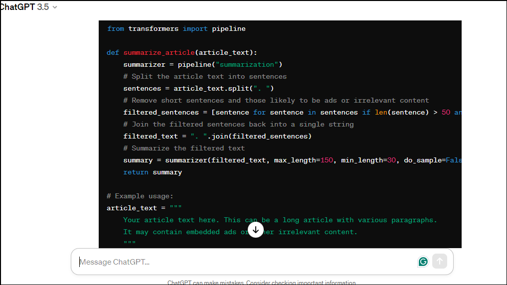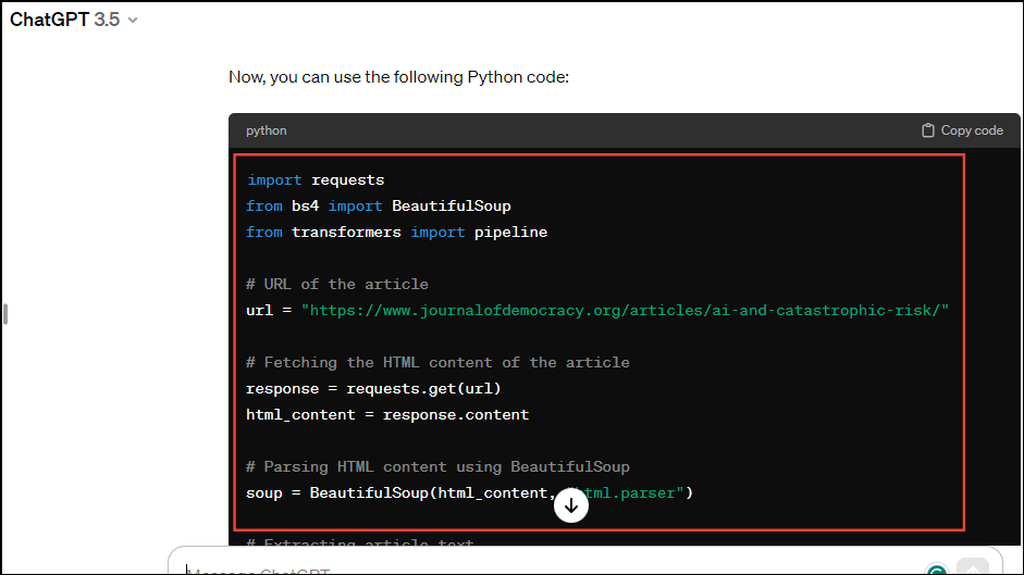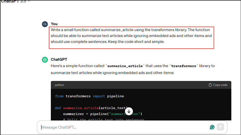 - Now, you need to decide what the purpose of your code will be. ChatGPT can write code to perform a specific function or perform routine tasks. For instance, you want the AI model to summarize the article on any web page.