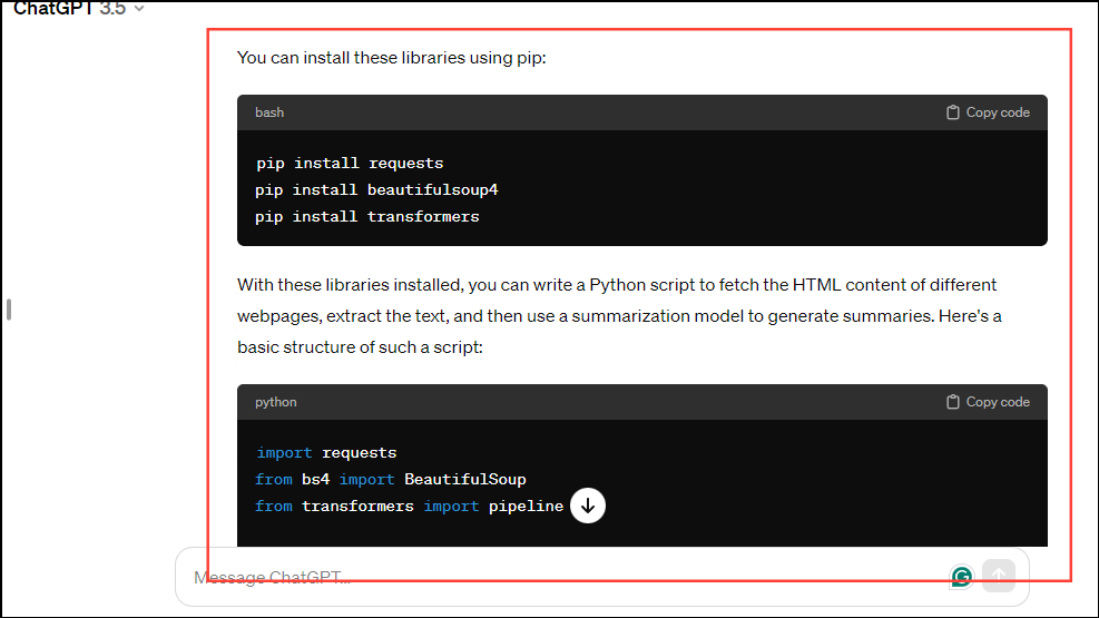 For instance, you can enterwhat libraries are needed for a code that summarizes content on different webpages.