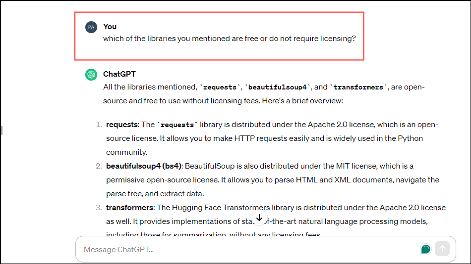 For instance, you can ask ChatGPTwhich of the libraries you mentioned are free or do not require licensing?, the AI model will provide you with the answers.