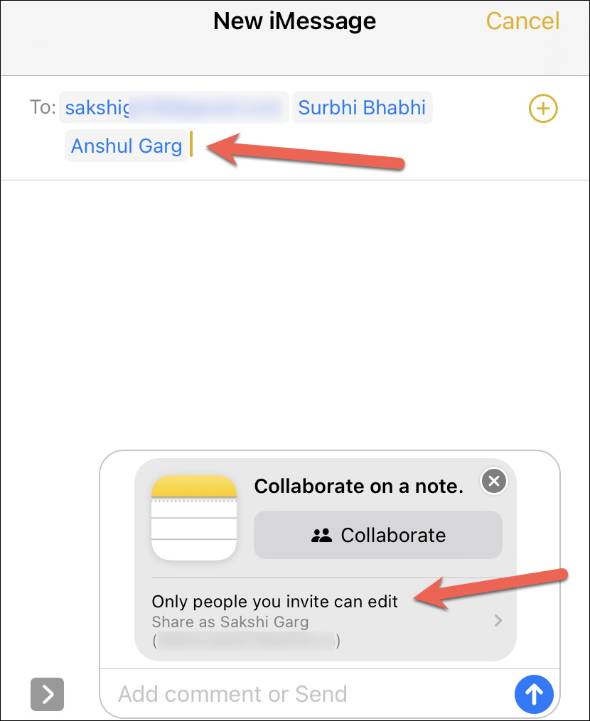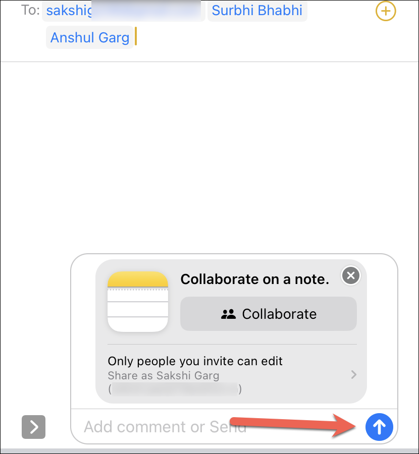 The invitation for the shared project (in this case, the note) will load in the message box. You’ll be able to see and still edit the permissions from the invitation before sending it without having to go back to the Share Sheet. Once you’re satisfied with all the settings, enter the name of the contacts you want to add to the note in the ‘To’ section.