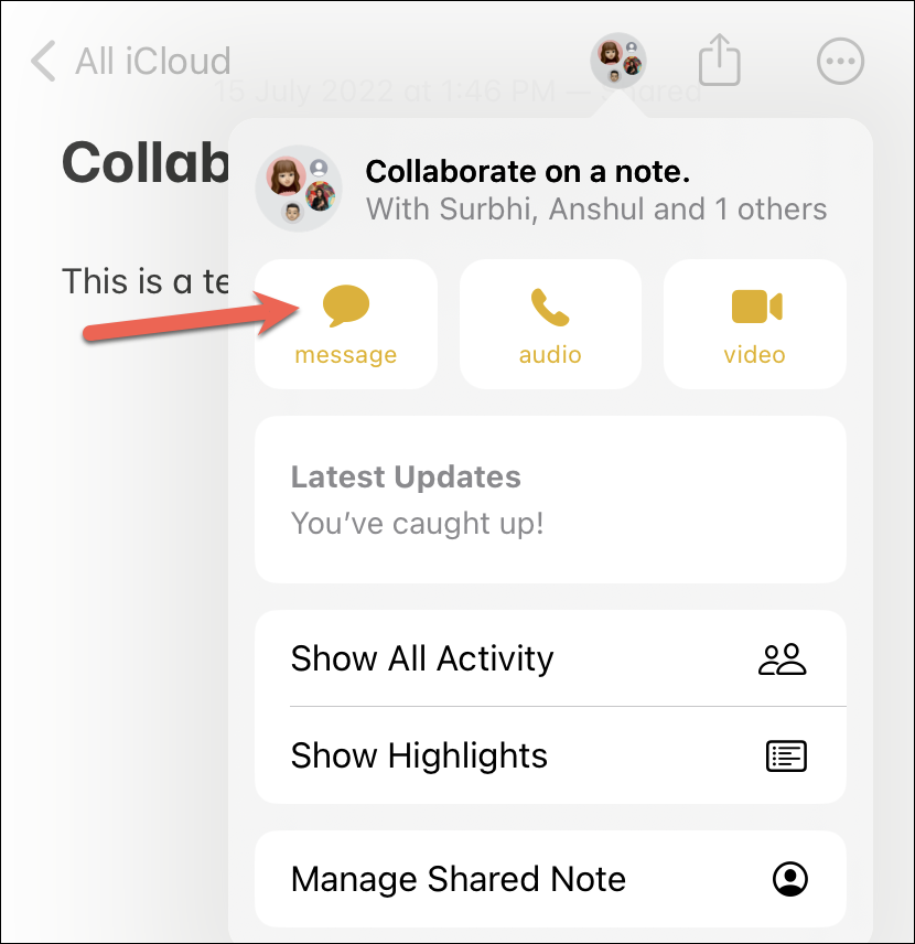 Tap the collaboration icon or the conversation photo to open the collaboration pop-over. The collaboration pop-over makes it easy to access the communication tools, like Messages, FaceTime audio, and FaceTime Video. Tap the ‘Message’ option to begin a conversation with everyone added to the note.