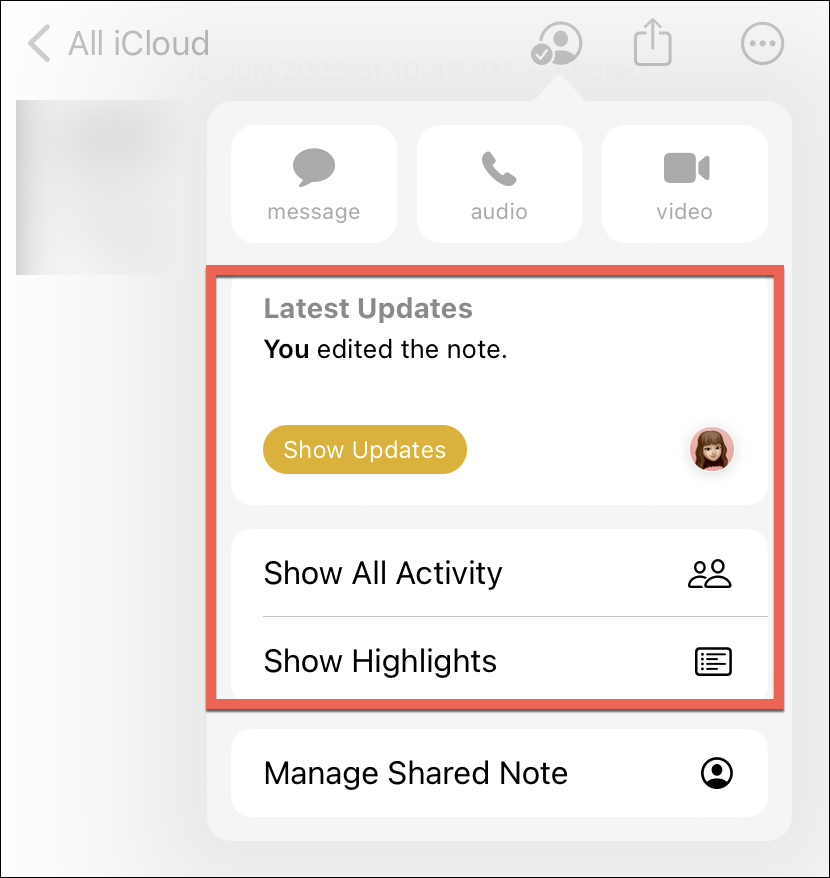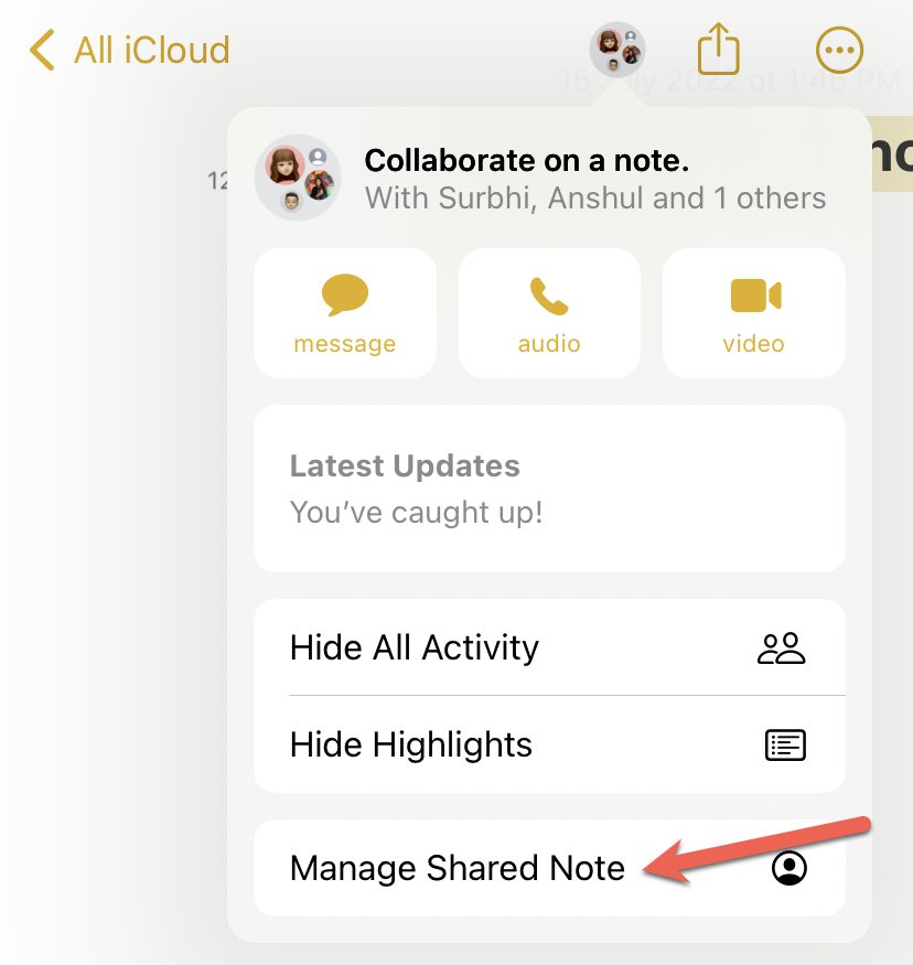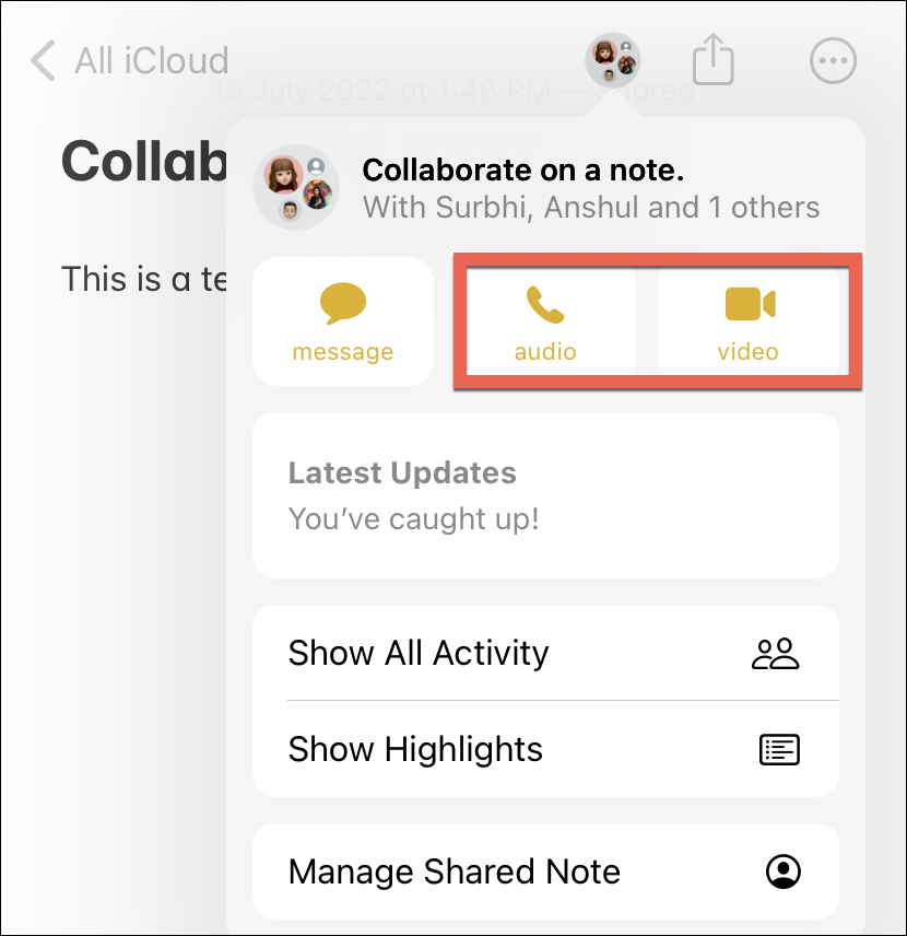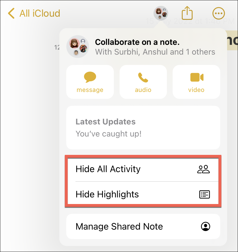The Notes app displays a quick overview of all the collaborative updates in the ‘Latest Updates’ section instead of the active people along with the options to show all activity and highlights. When your friends make edits to the note in real-time, you’ll see the latest updates related to those edits here. Reminders and Files, on the other hand, might not have anything in this section at all. That’s to say that the Collaboration pop-over will vary depending on the app