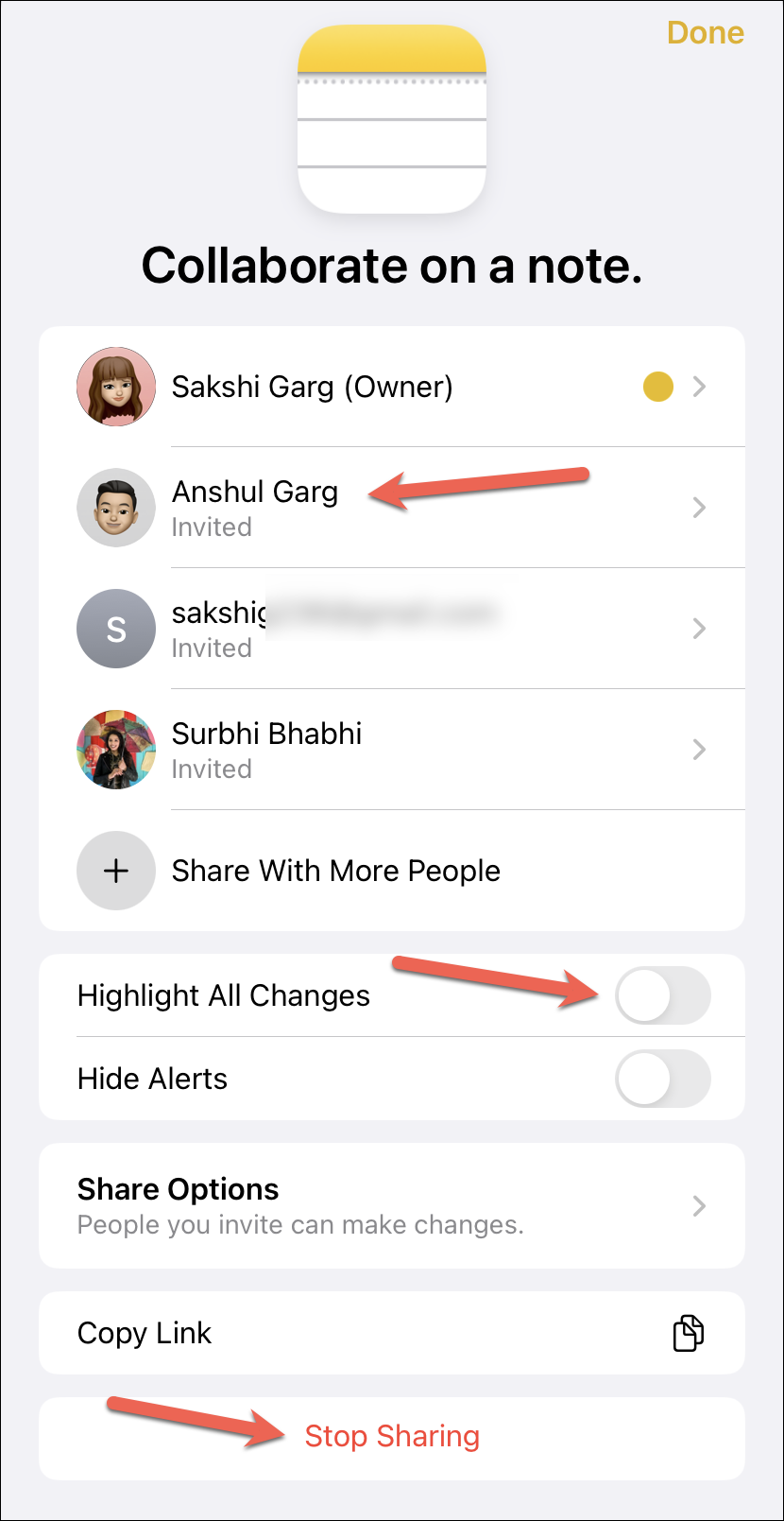 Here, you can change permissions or access to the note and invite more people or remove someone. You can also enable the option for ‘Highlight All Changes’ to keep seeing who made what changes to the note by default. Tap ‘Stop Sharing’ to stop collaboration entirely, or tap a person’s name to manage permissions individually.