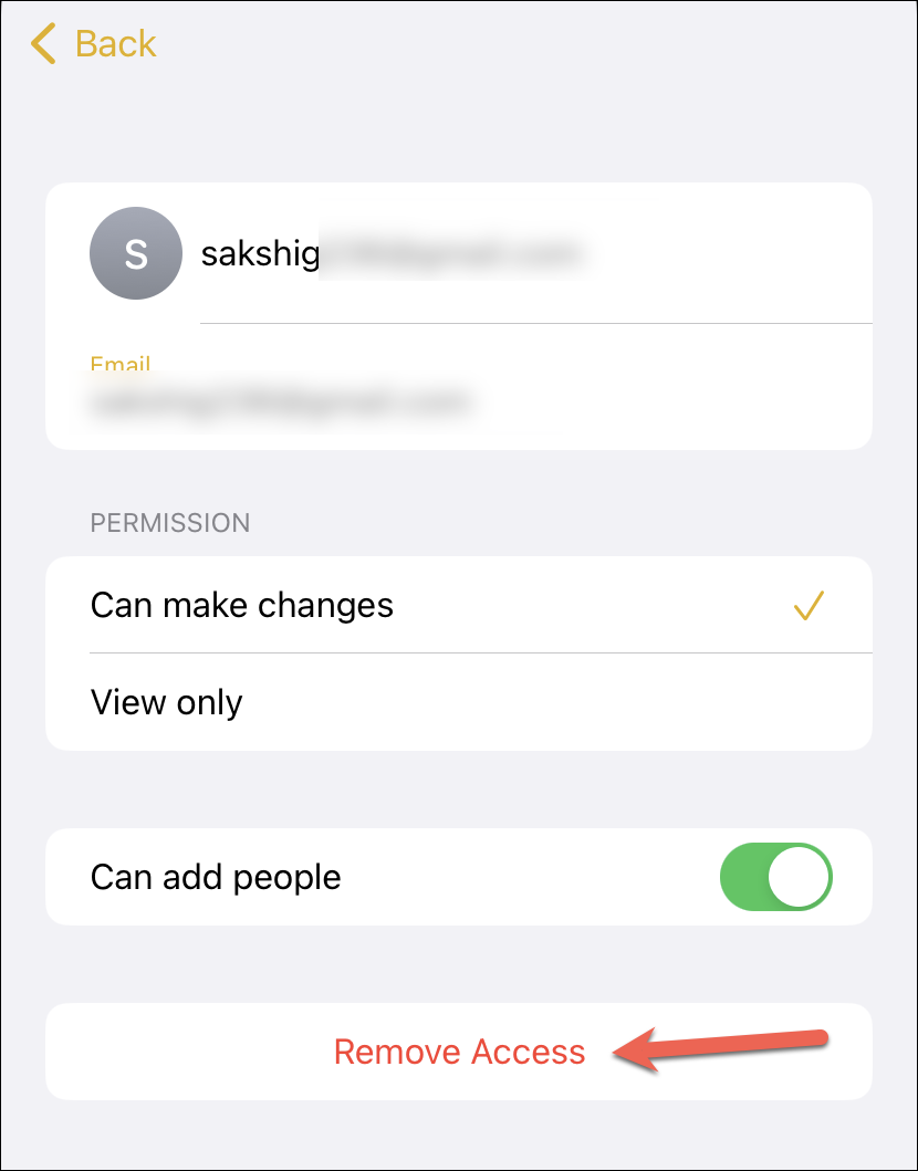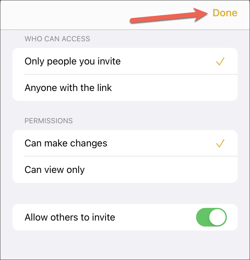 An overlay menu will open. Here, you can make changes to ‘Who Can Access’ the note, and whether others can make changes or only view it. Tap ‘Done’ in the upper-right corner to close the permissions.