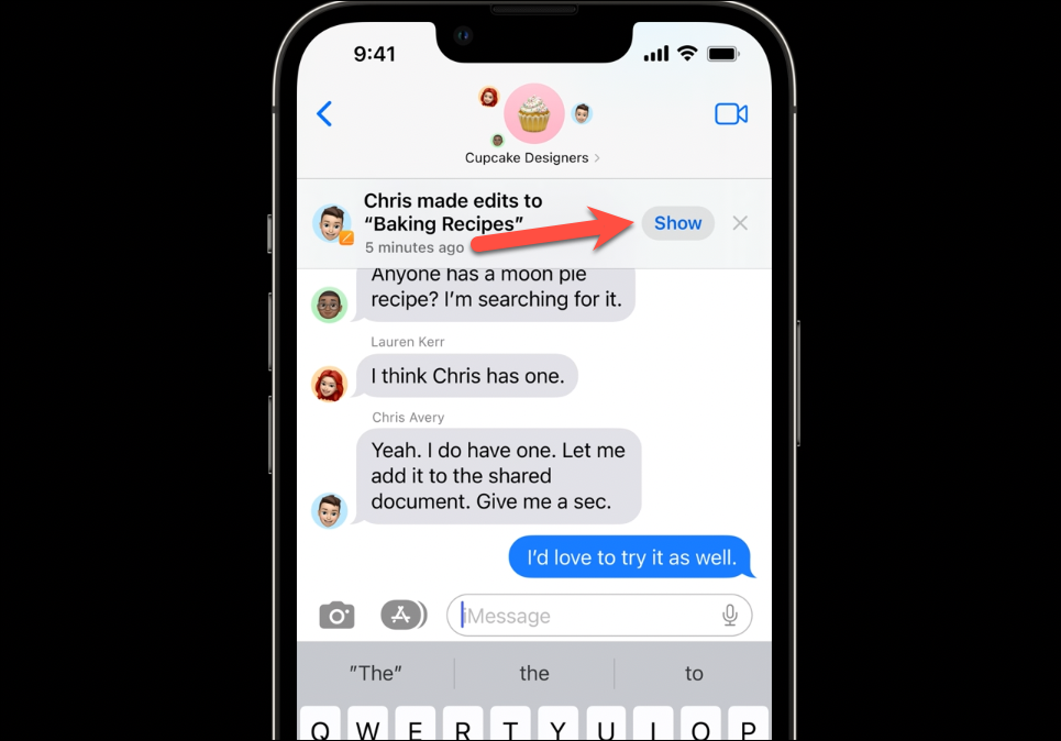 Whenever someone makes an edit to the project, a banner will appear at the top of the conversation to notify you of the update. Suppose someone makes an edit to the document, then the notification “[Person] made edits to the [Note Name]” will appear in the conversation. Tap ‘Show’ from the banner to open the shared project or ‘x’ to dismiss the notification.