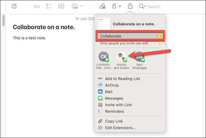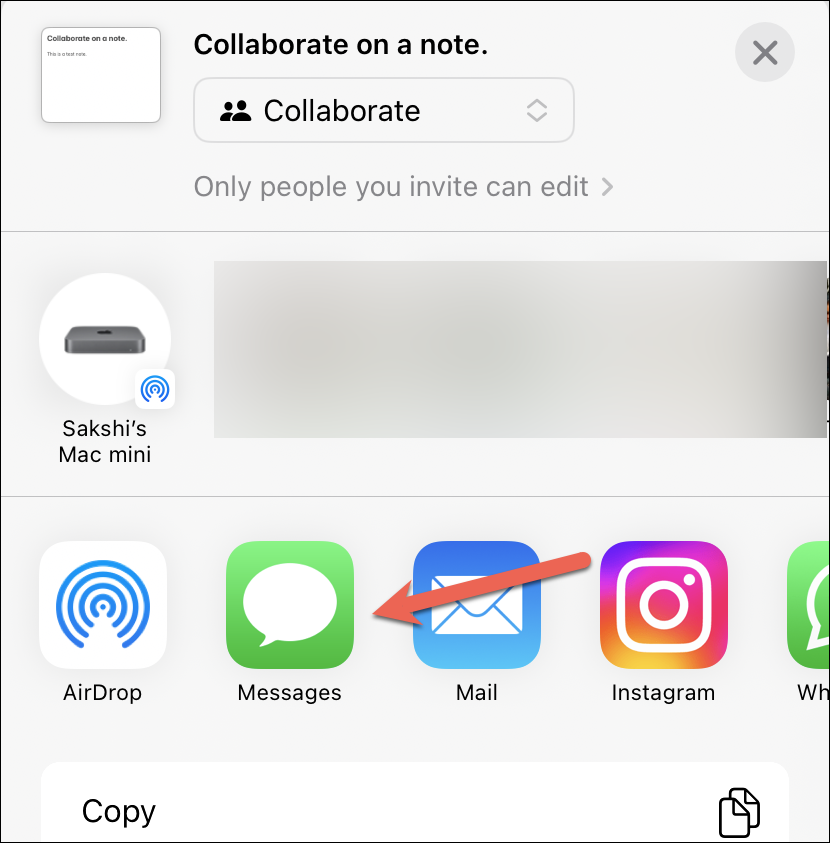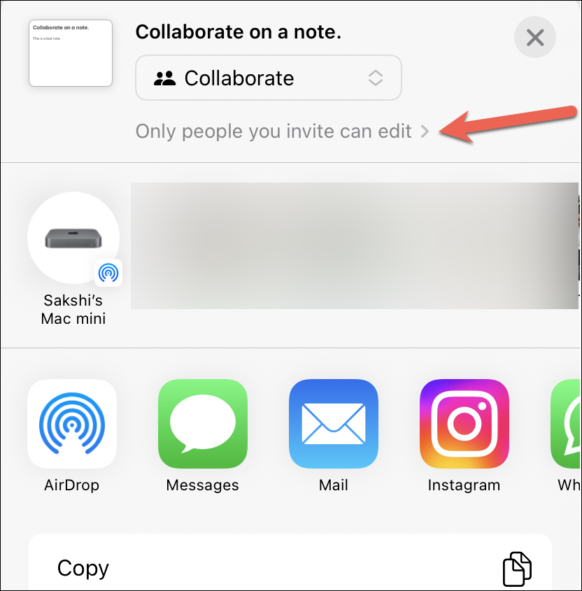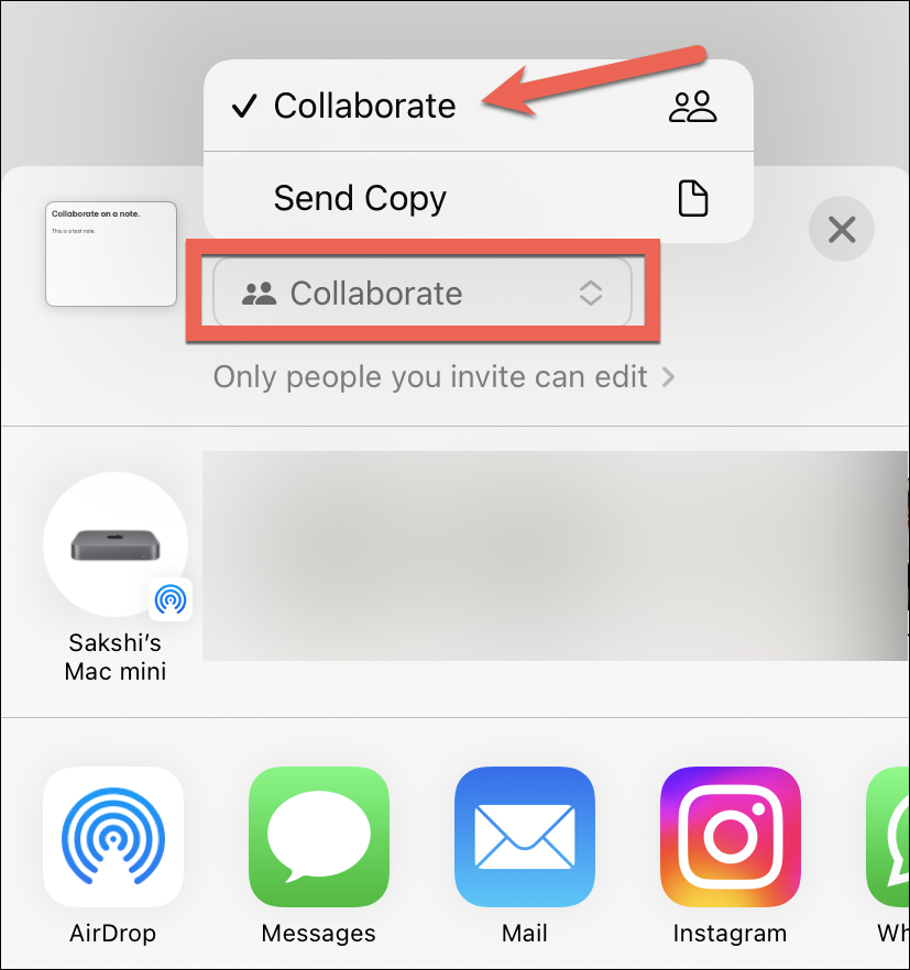 The Share Sheet will open. You can choose whether you want to share a copy of the note with someone or collaborate on it. Choose ‘Collaborate’ from the options.