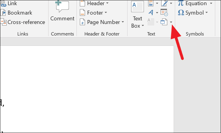 Step 2: In the Insert tab, you'll find various options to insert pages, tables, and more. Navigate to the Text section and click on the drop-down arrow next to the Object icon.