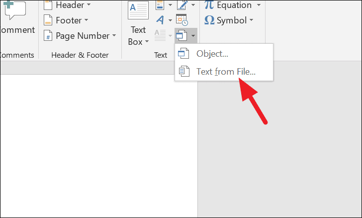 Step 2: Open a new Word document. Click on the Insert tab, then click the drop-down arrow next to the Object icon in the Text section, and choose Text from File....