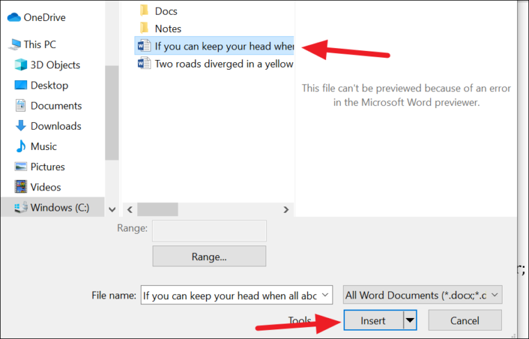 Step 3: In the Insert File dialog box that appears, navigate to the folder containing your documents. Select the first file you wish to insert and click on Insert.