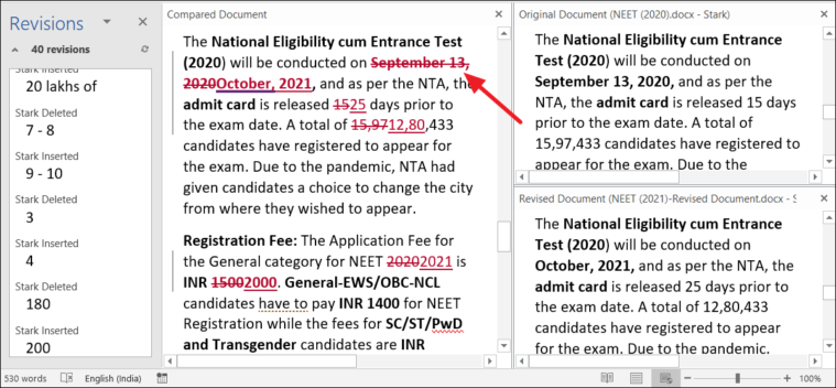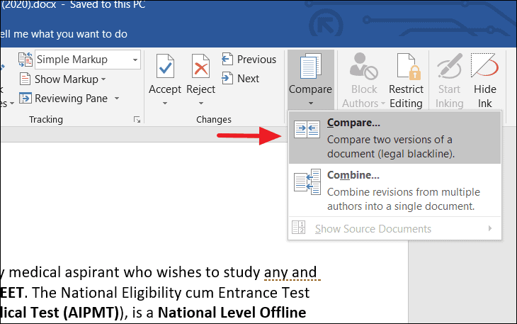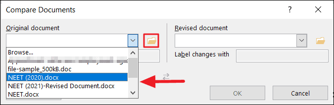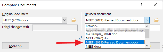 Step 4: Click the drop-down menu next to Original document and choose the initial version of your document from the list (e.g., NEET (2020).docx in this example).