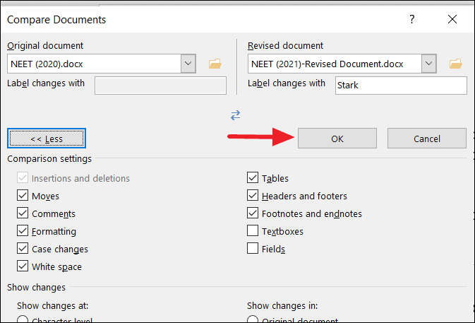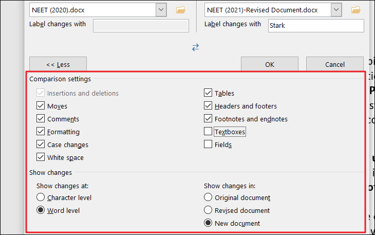 Step 9: Under the Show changes section, decide how changes are displayed—either character by character or word by word. Additionally, choose where to display the changes: in the original document, the revised document, or a new document. Selecting New document is recommended to keep your original files intact.