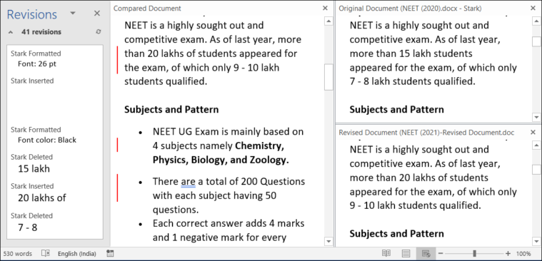 Step 11: A new window will open displaying the comparison results in four panes. The central pane shows the Compared Document with all changes highlighted and red markers along the left margin. On the right, two panes display the Original and Revised documents side by side. The Revisions pane on the left lists all changes, including insertions, deletions, and formatting alterations.