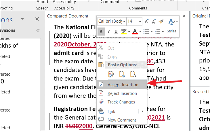 Step 13: To accept or reject individual changes, right-click on the specific modification in the document. Choose Accept Insertion to keep the change or Reject Insertion to discard it.