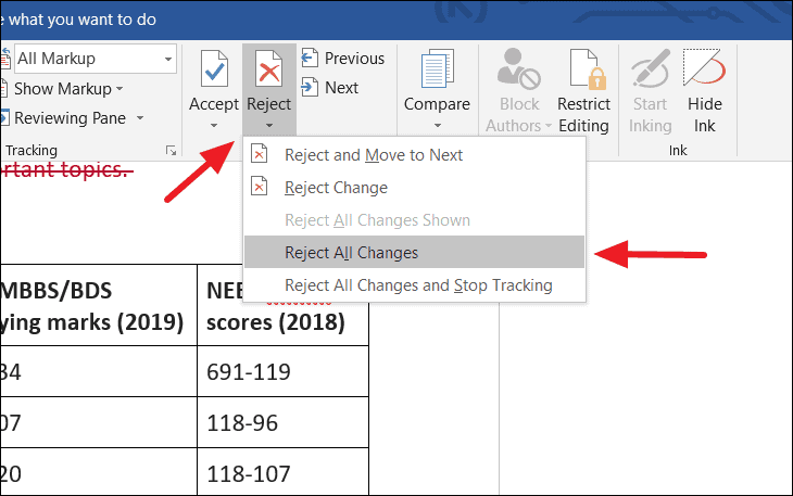 Step 15: To reject all changes at once, click the Reject drop-down menu next to the Accept button in the Review tab, and choose Reject All Changes.
